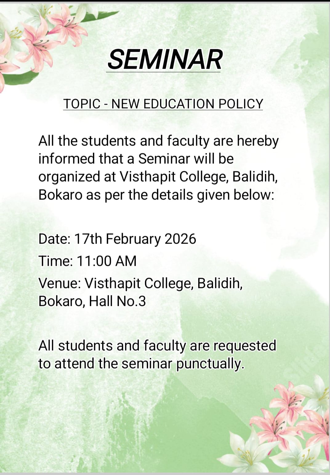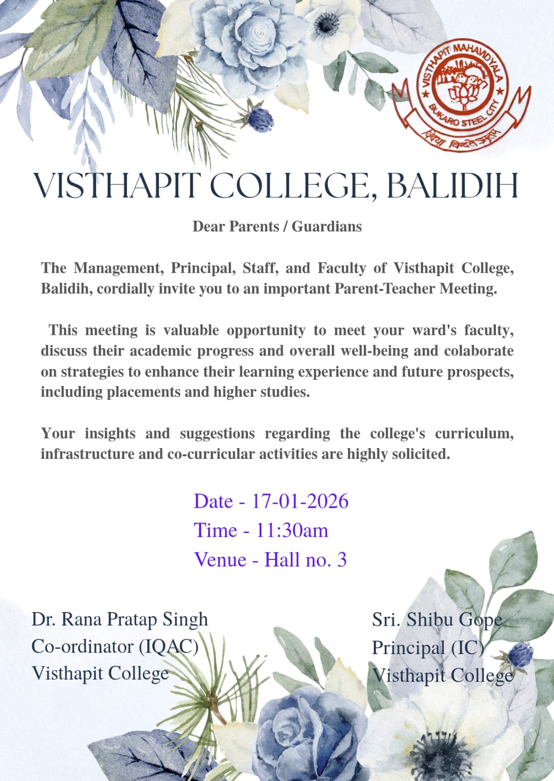 Visthapit Mahavidyalaya was established in the year 1986 at Balidih, Bokaro Steel City, Jharkhand. Spread over nearly 7 acres of lush green land, it is a degree college affiliated to the Binod Bihari Mahto Koyalanchal University, Dhanbad. The college is registered under Section 2(F) & 12(B) of U.G.C., New Delhi, and managed by Chas Bokaro Vikash Samiti, Chas, Bokaro, registered under the Society Act-21 of 1860 (Registration No.: 414/82/-83).