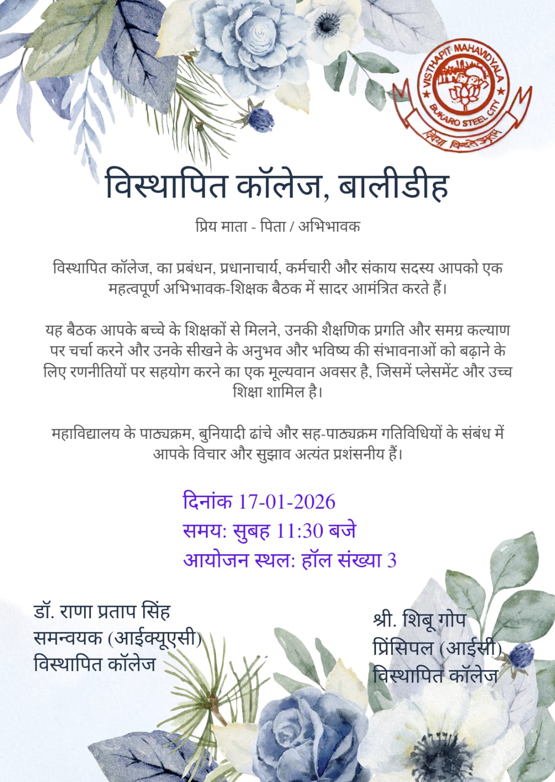 Visthapit Mahavidyalaya was established in the year 1986 at Balidih, Bokaro Steel City, Jharkhand. Spread over nearly 7 acres of lush green land, it is a degree college affiliated to the Binod Bihari Mahto Koyalanchal University, Dhanbad. The college is registered under Section 2(F) & 12(B) of U.G.C., New Delhi, and managed by Chas Bokaro Vikash Samiti, Chas, Bokaro, registered under the Society Act-21 of 1860 (Registration No.: 414/82/-83).